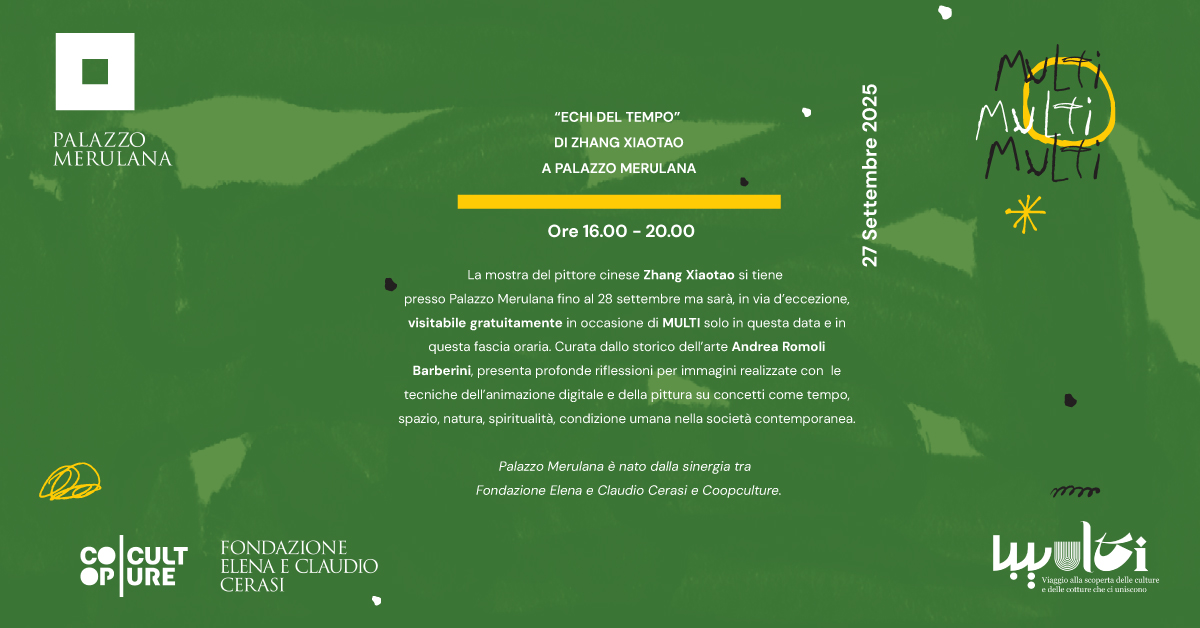 Infatti, la mostra Echi del tempo, personale dell’artista cinese Zhang Xiaotao, sarà visitabile gratuitamente a Palazzo Merulana sabato 27 settembre dalle ore 16.00 alle ore 20.00, proprio in occasione del FuoriMulti, rassegna all’interno del festival Multi – Viaggio alla scoperta delle culture e delle cotture che ci uniscono che si tiene al di fuori dei giardini di Piazza Vittorio.