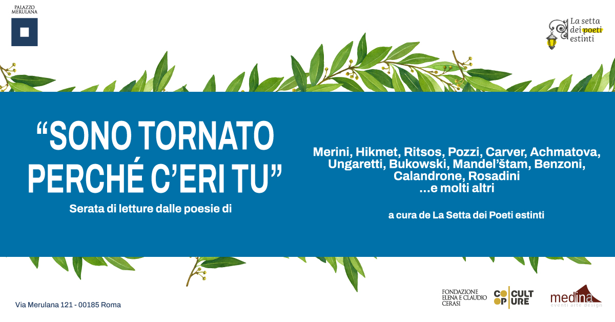 Da Alda Merini ad Anna Achmatova, passando per Nazim Hikmet, Ghiannis Ritsos, Antonia Pozzi, Giuseppe Ungaretti, Charles Bukowski, Raymond Carver e molti altri, fino ad arrivare ad autori e autrici contemporanei come Maria Grazia Calandrone, nel Salone delle Pitture di Palazzo Merulana daremo voce a quei testi che ci accompagnano in ogni occasione, permettendoci di affrontare le difficoltà e di godere le gioie della vita.