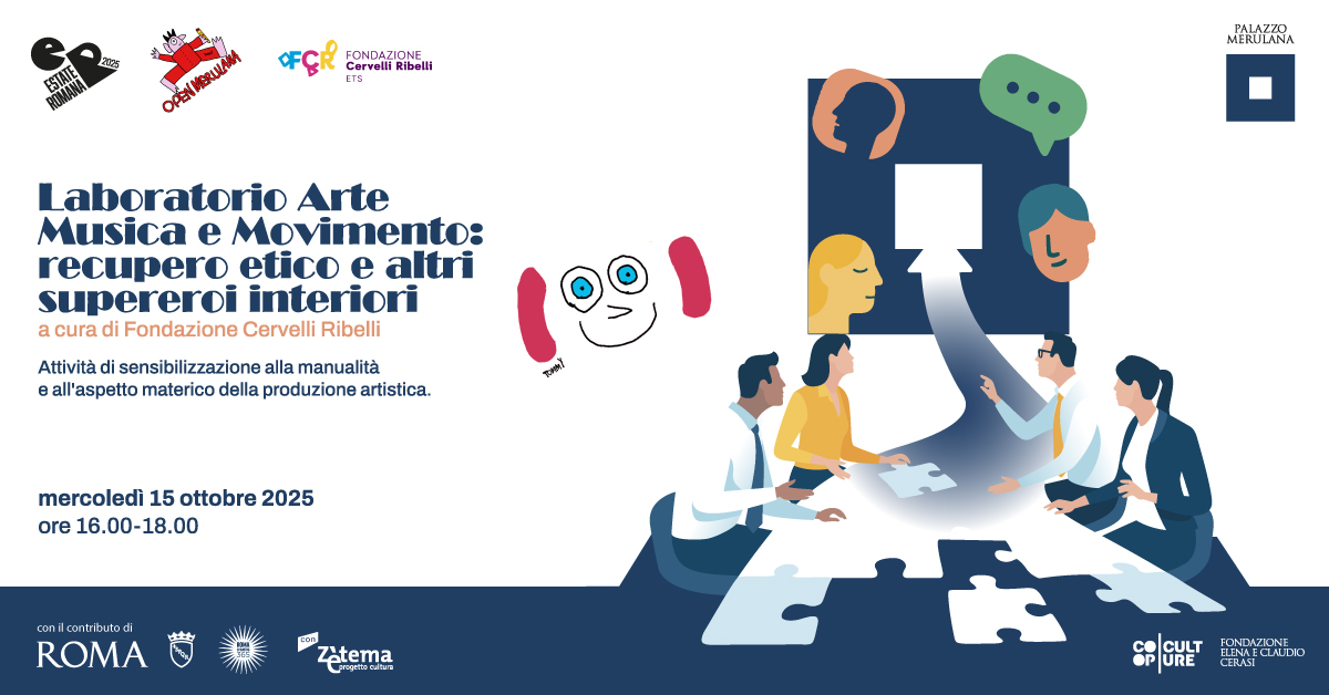 Palazzo Merulana è lieto di ospitare “Laboratorio Arte Musica e Movimento: recupero etico e altri supereroi interiori” all’interno del programma “FormAzione per il Museo Gentile Open Merulana 2025-2026” promosso da Roma Capitale – Assessorato alla Cultura, vincitore dell’Avviso Pubblico Roma Creativa 365. Cultura tutto l’anno in collaborazione con Zètema Progetto Cultura e con Fondazione Cervelli Ribelli Ets.